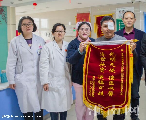“感谢你们对病人的细心呵护!”4月11日,淮南日报社帮扶干部和时应宏的家属将写着“光明天使德艺双馨 济世扶贫造福百姓”的锦旗送到东方医院集团总院眼科医生手中。