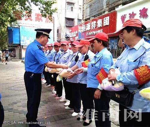 图:谢家集区城管行政执法局负责人为文明劝导员送来消暑物品(通讯员 张梅 记者 冉韬 编辑 汤宁)
