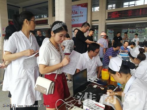 8月8日上午,淮河早报、淮南网记者来到淮南新康医院,只见一辆献血车停在门诊大楼前,大厅内人头涌动,许多穿着白大褂的医护人员在献血登记台前排队等候,而在一旁献血点上,许多医护人员已挽起袖子开始献血。