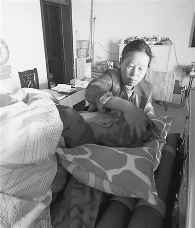 图为胡立华正在照顾瘫痪在床的丈夫。