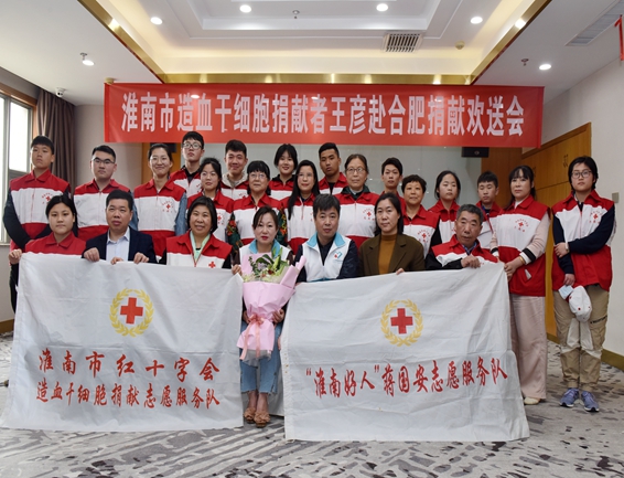 4月18日,淮南市红十字会组织近30名志愿者为该市第27例、安徽第224例造血干细胞捐献者王彦赴合肥捐献壮行。