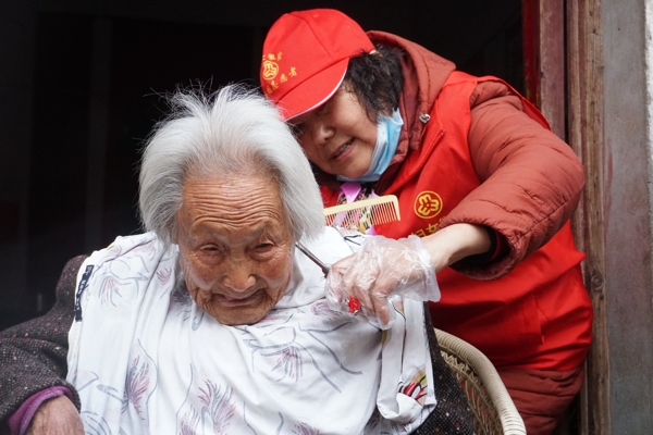 最后,巾帼志愿者为老人理发,大家与老人依依不舍道别。